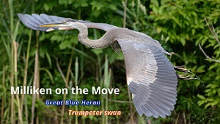 Milliken on the Move - A lovely day spent with the Trumpeter swan family, watched the devoted parents caring their young, teaching them to forage, preen, and recognize danger. Another surprise of the day is to watch a lone Great Blue Heron flying back and forth, displaying his unique flight.